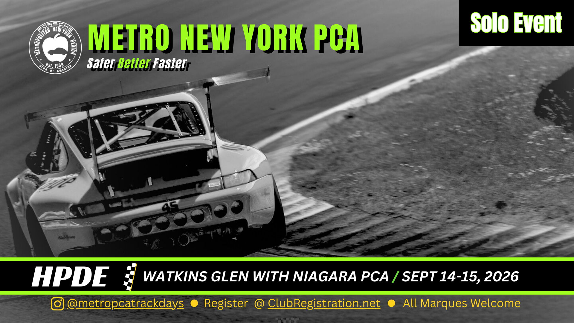 Metro's first ALL SOLO 2026 HPDE, open to vetted White, Black, and Red Group drivers. Two run groups will each have 3.5 hours of scheduled track time. Very limited registration numbers for this special event.