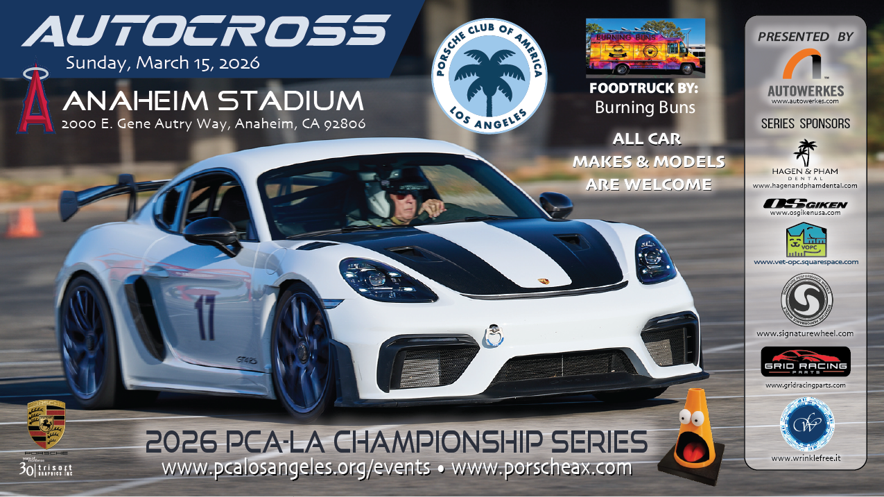 PCA Los Angeles invites you to come out and join us for the 3rd event in our monthly autocross series. Our series has been organized by volunteers with a long history of running POC and PCA sanctioned autocross events. Autocross is a fun way to learn the basic handling dynamics of your car in a controlled environment.